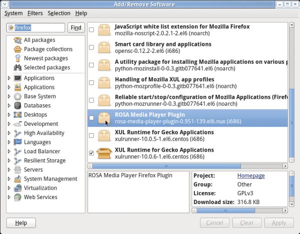 And you can see that just by looking at the package manager. The package categories tell you that everything you can find in CentOS is also available in Stella. Plus desktop applications that you will not find in any default installation of CentOS. For example, an application listed in the screen shot below, is ROSA Media Player (ROMP), the default media player in ROSA Desktop, a distribution based on Mandriva Linux.